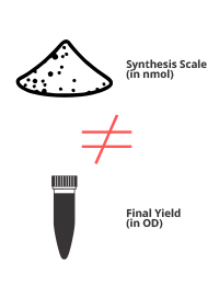Remember that the synthesis scale (25 nmol, 100 nmol etc.), refers to the STARTING MATERIAL for oligo synthesis, and NOT the FINAL yield. Oligo length, sequence, GC content and coupling efficiencies alter the final nmol yield. Different purification methods alter the final yield as well. Bio Basic guarantees the final yield of each oligo nucleotide as a fixed yield in OD units.